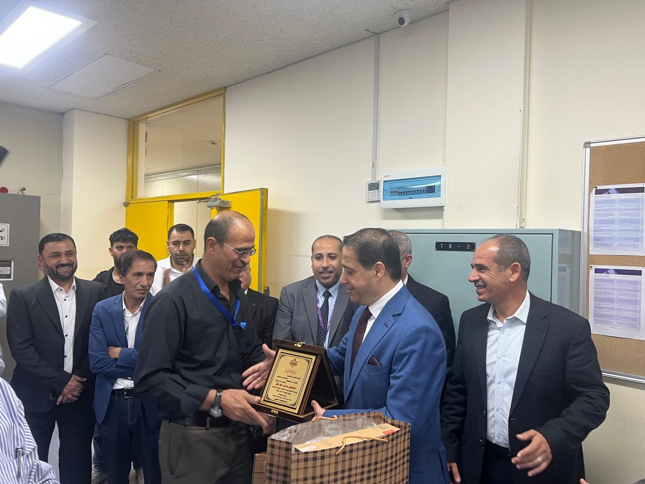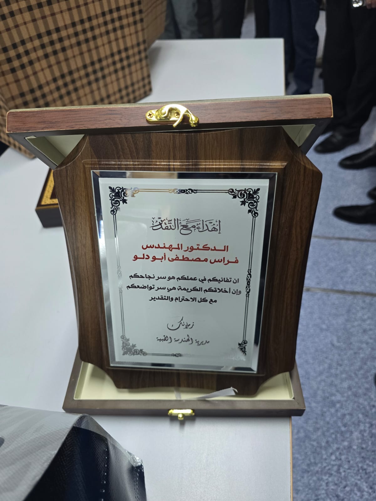 و بحضور ثلة من الزملاء المتقاعدين قامت كوادر المديرية ممثلة بمدير مديرية الهندسة الطبية المكلف المهندس أمين الدويري بتسليمه الدرع الخاص بالمديرية متمنين له كل التوفيق في حياته الخاصة.